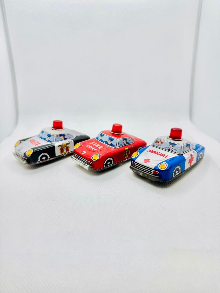 - 昭和レトロ 当時物 柏井製作所 ブリキ 消防車 救急車 パトカー 3台セット 日本製 約9.5センチ ミニカー ビンテージ