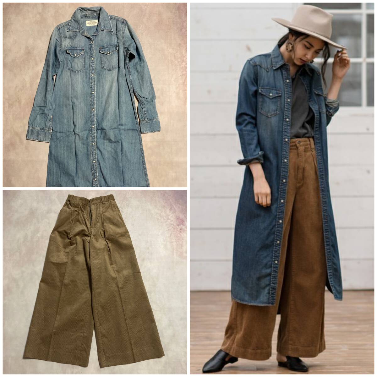 - モデル着用風コーデ 2点セット ☆ goa ☆ デニム ロング シャツワンピース & コーデュロイ ワイドパンツ / ネイティブ / ゴア / レディース