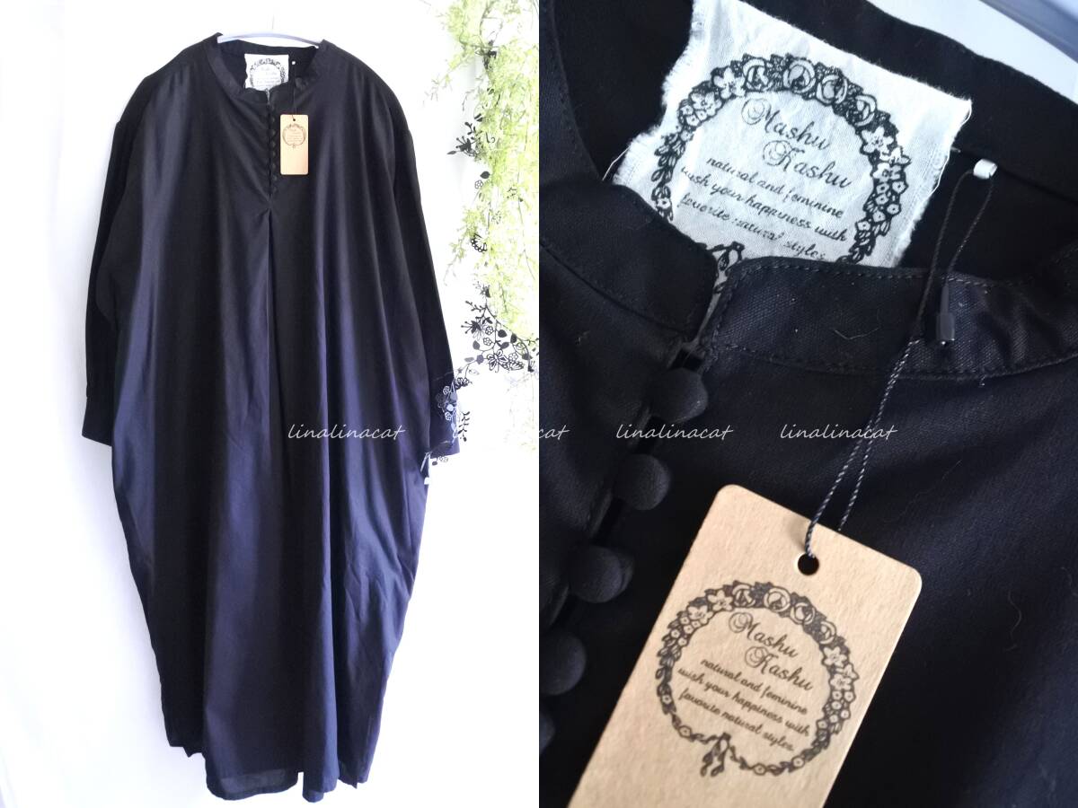 - 未使用タグ付 マシュカシュ*リネン コットン ギャザー ワンピース ブラック 布くるみボタン クラシカル