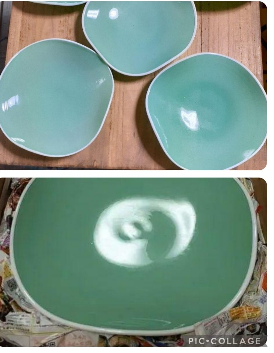 - 緑色の不規則な形の皿 30cm弱大皿一枚と15cm中皿5枚のセット