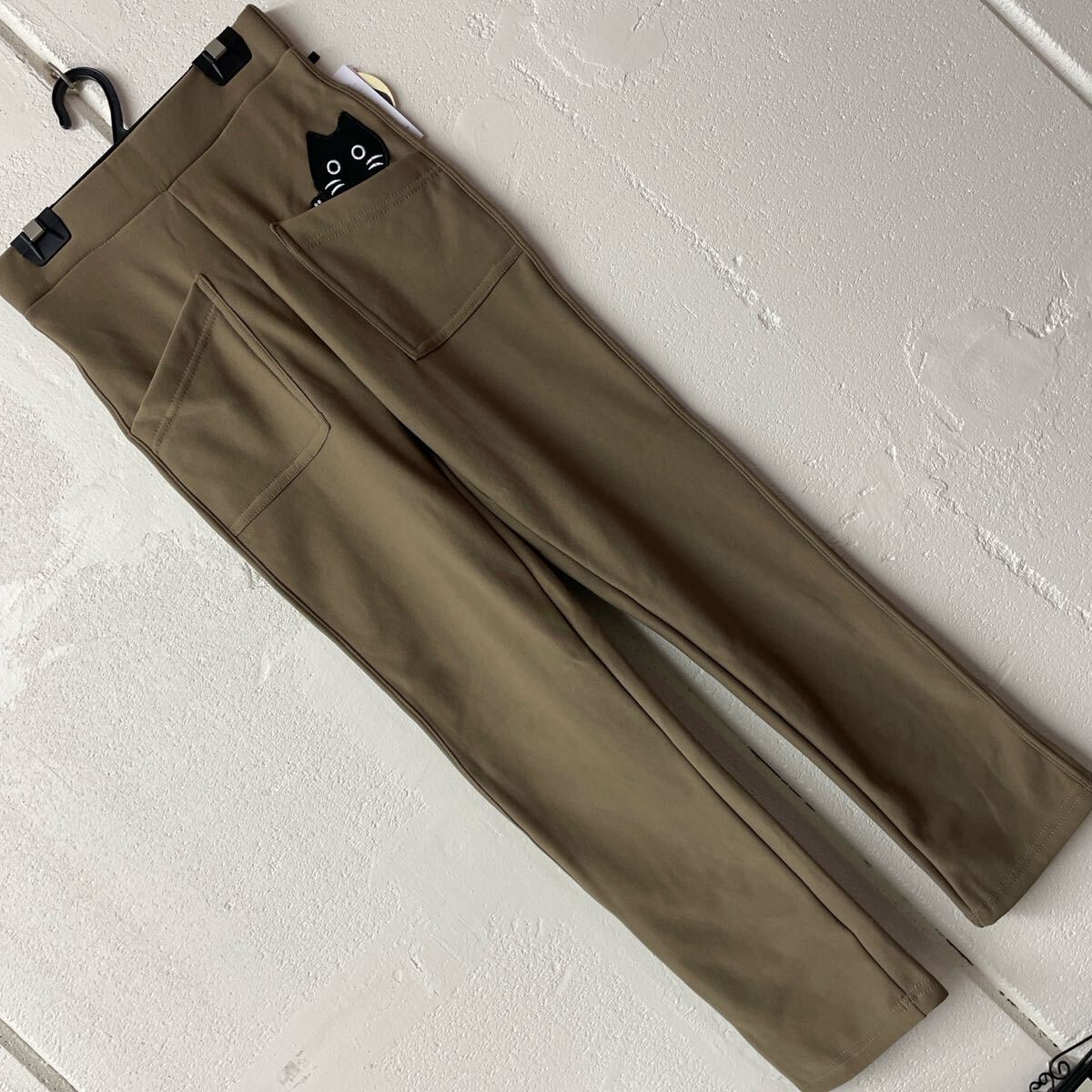 - 暖か裏起毛前ポケットねこアップリケパンツ モカ