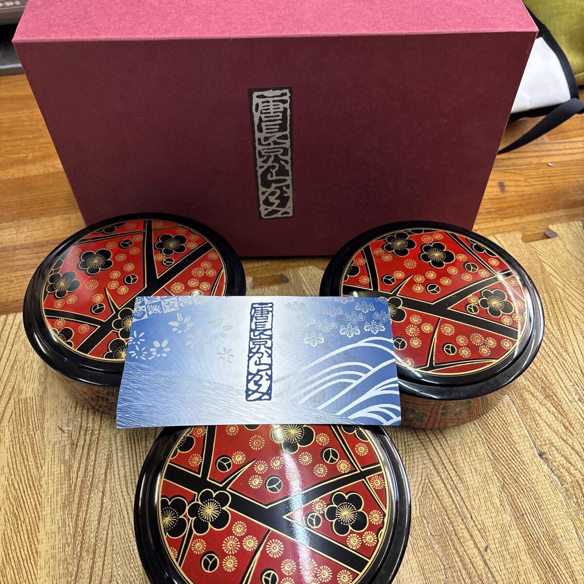 - 12-139 【長期保管品】唐長京からかみ 菓子箱 菓子器 茶道具 梅赤金彩