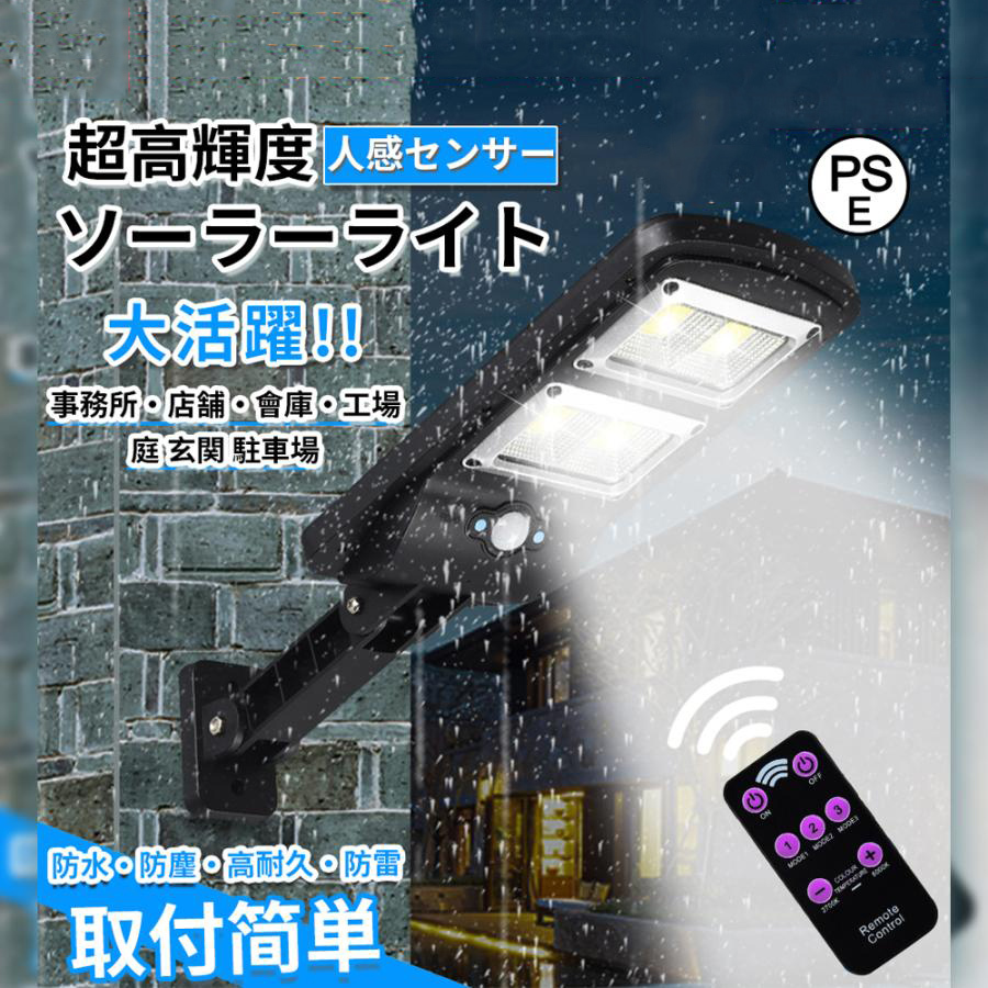 - ソーラーライト センサーライト リモコン付き 屋外 防犯ライト 防水 64LED 街灯 ソーラー充電式 省エネ 高輝度 人感センサー 3つ点灯モード