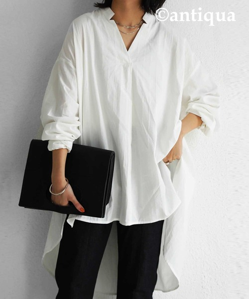- antiqua アンティカ patterntorso 変形ロングシャツ プルオーバーシャツ ノーカラー WHT サイズF