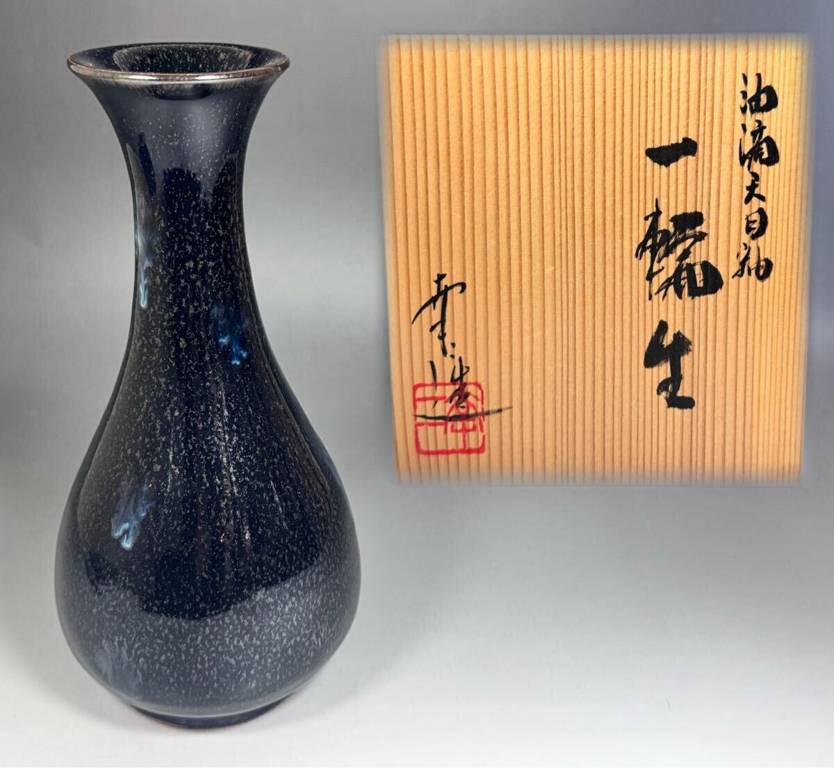 - 鎌田幸二 造 油滴天目釉 一輪生 共箱 花瓶 花器 花入 花生 一輪挿し 天目 名工