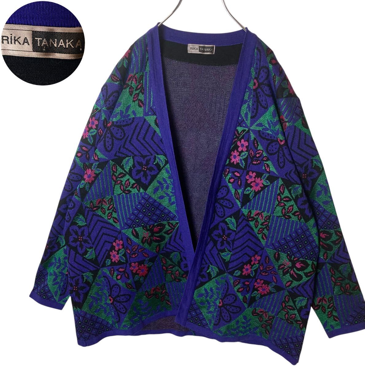 - 日本製レトロ古着パープルマルチカラー花柄総柄ニットガウンカーディガンゆったり