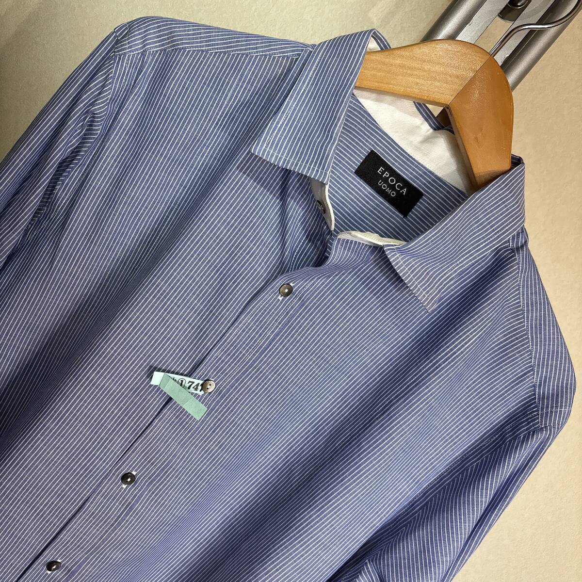 - X403美品!■エポカUOMO★インディゴ*白ストライプ/麻混★デザインシャツ■50