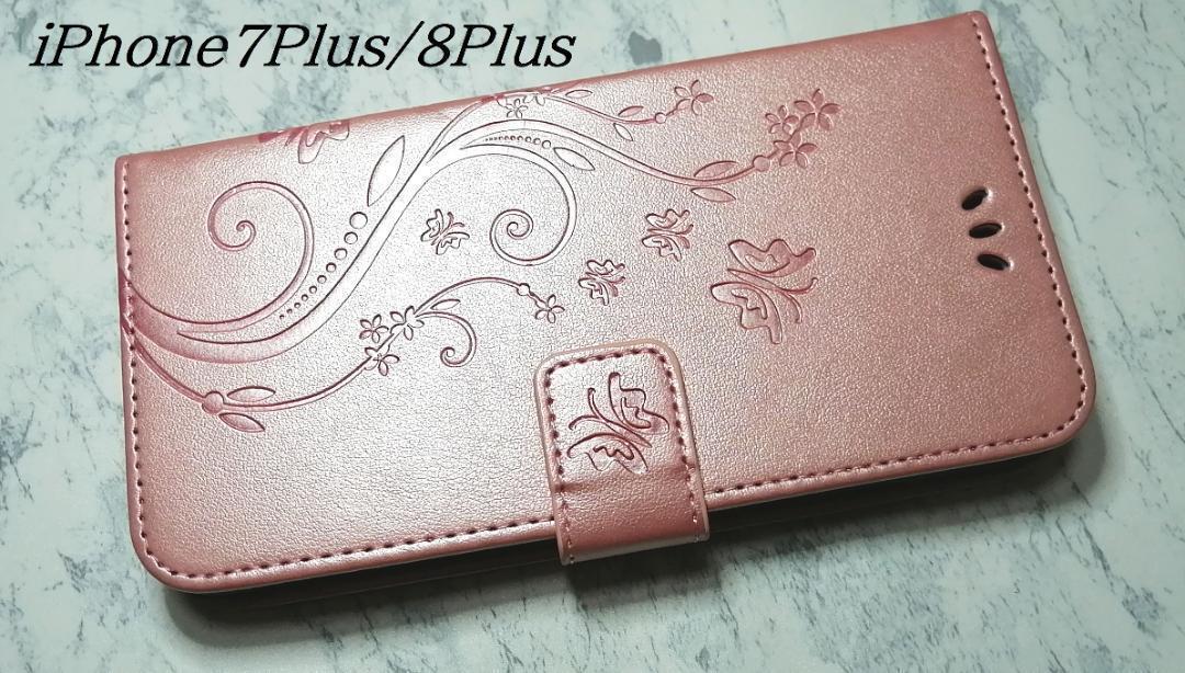 > 送料込み iphone7plus/8plus ケース 手帳型 草花 蝶 ピンクゴールド
