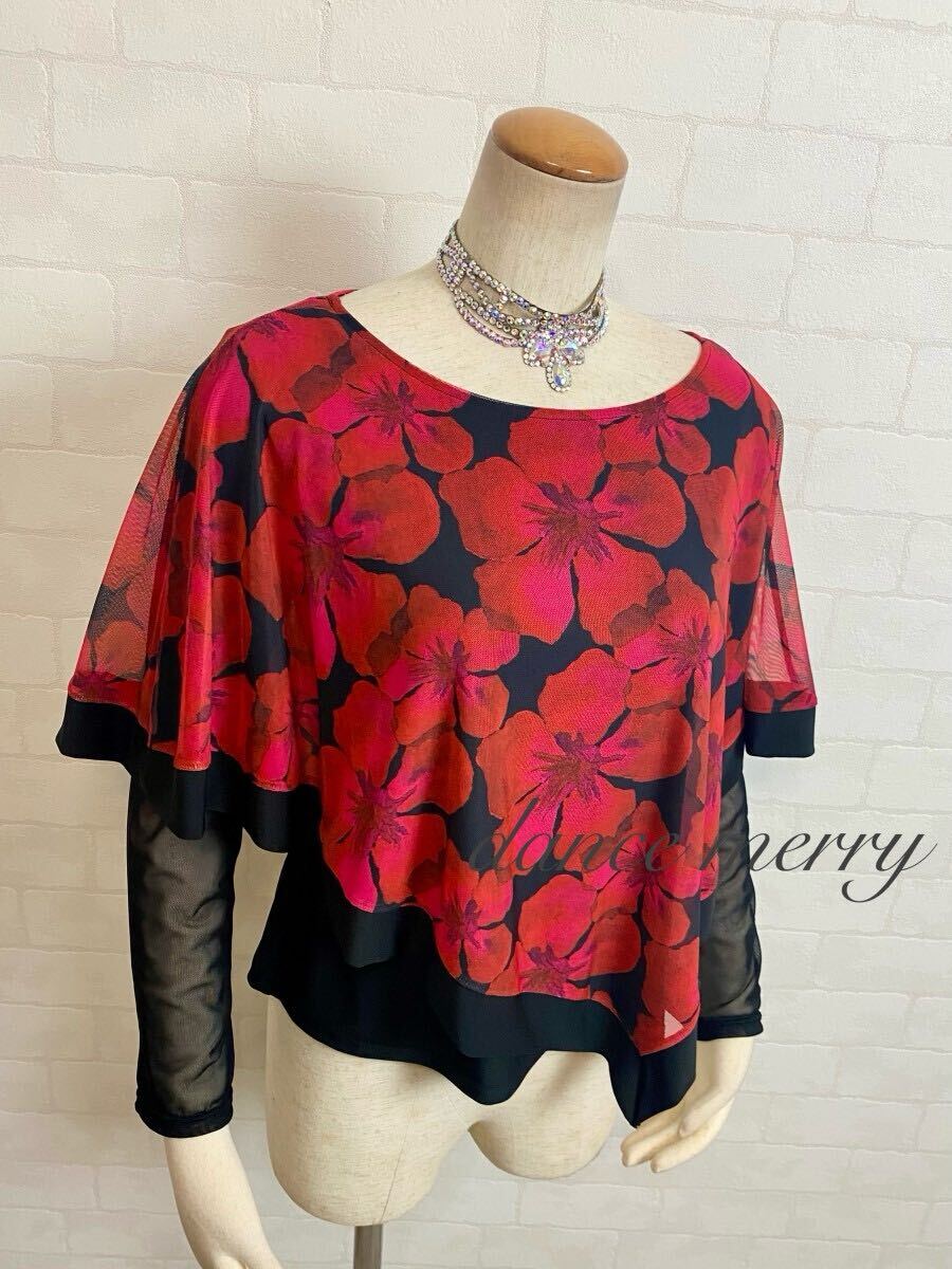 > ★送料無料★【MERRY】新品 限定Lサイズ ゆったり 社交ダンス 赤 黒 花柄 トップス 2117 レッスン パーティ タンゴ パソ ラテン ステージ