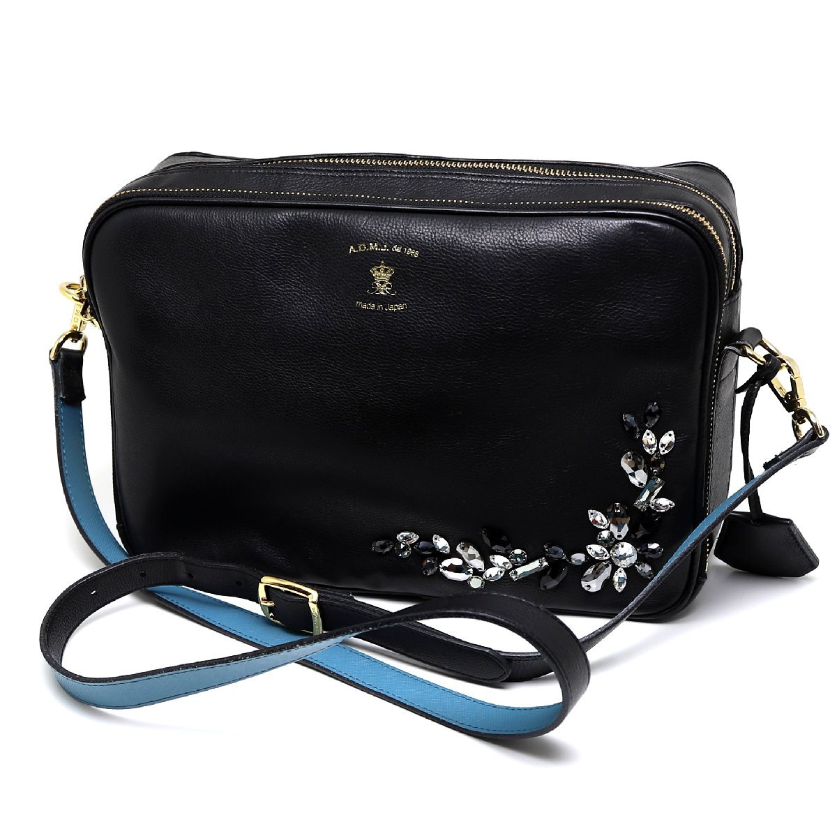 - 中古品 A.D.M.J. スワロフスキー スクエア ショルダーバッグ ネイビー ソフトレザー ゴールド金具
