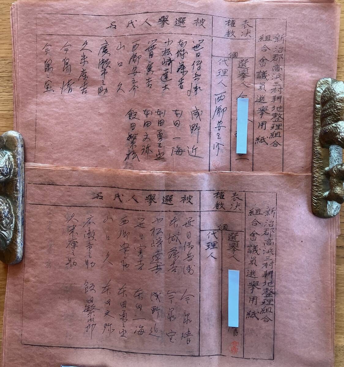 - 新治郡高浜三村耕地整理組合組合会議印選挙用紙 被選挙人:笹目傳兵衛・本城藤吉・小松崎達士・笹目寅吉・西郷安之介・本田一海等茨城農業