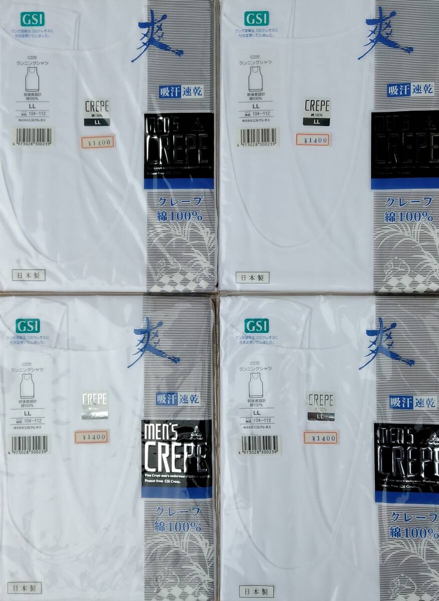 - クレープ ランニングシャツ サイズLL 4枚 綿100% 未使用 未開封 日本製 ちぢみ 白無地 CREPE GSIクレオス C220