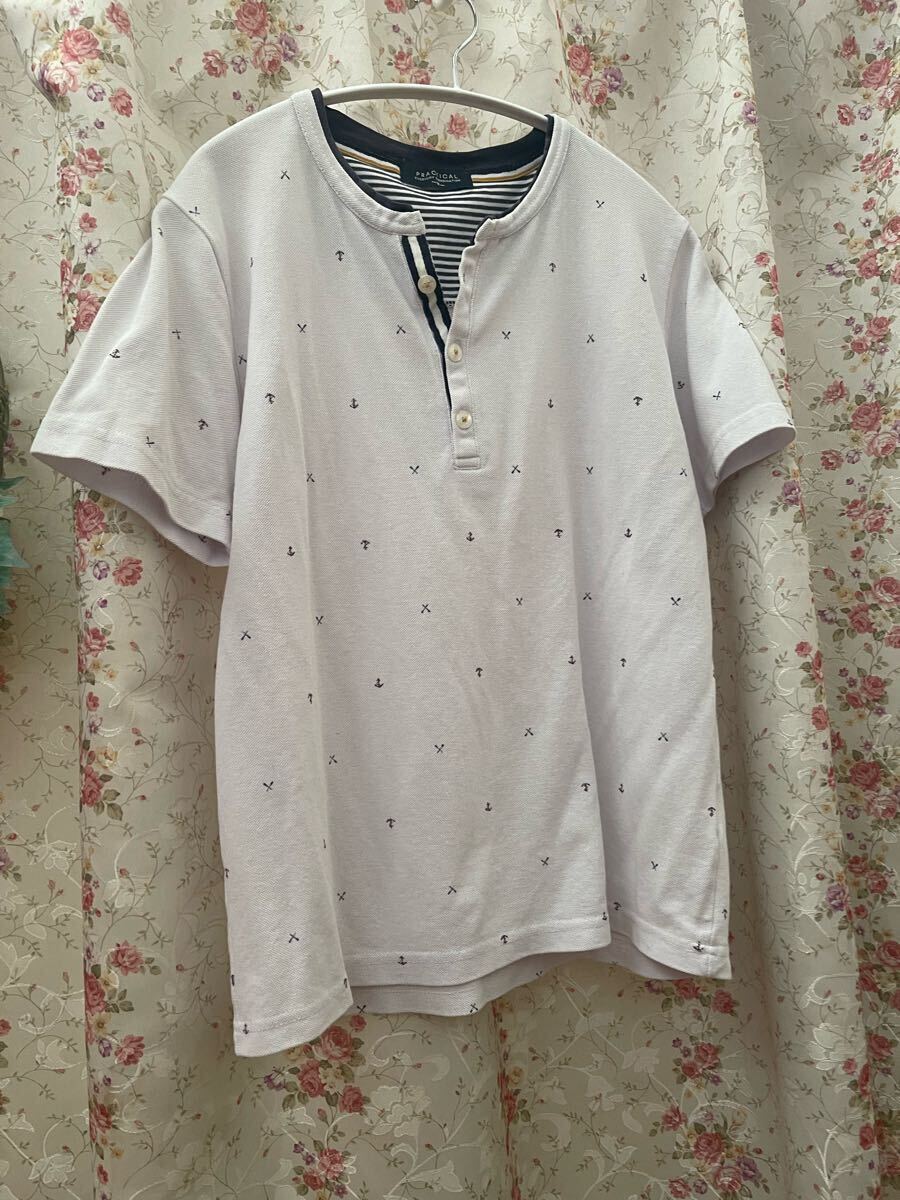 - メンズ 白 半袖 Tシャツ ヘンリーネック 綿混 イカリ柄 ポロシャツ