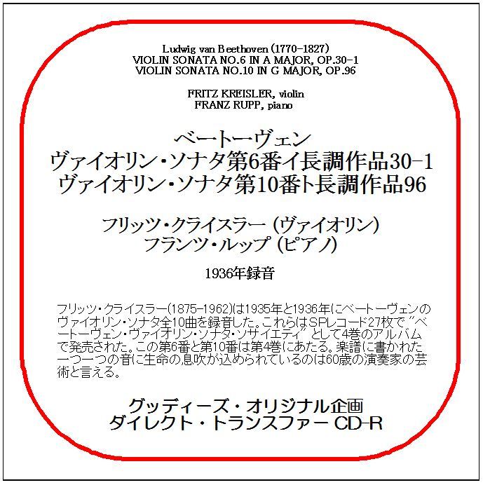 - ベートーヴェン:ヴァイオリン・ソナタ第6&10番/フリッツ・クライスラー/送料無料/ダイレクト・トランスファー CD-R