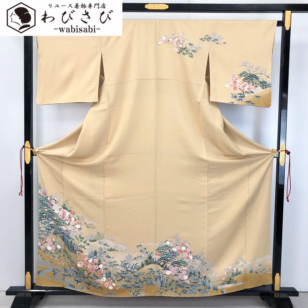 - 訪問着 友禅 松竹梅 流水模様 縮緬 鳥の子色 K-4500 着物 きもの kimono 和服 和装 中古 リサイクル着物 【送料無料】