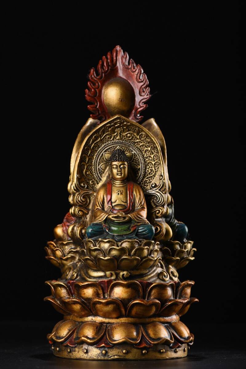 - 【超珍館蔵】銅製 金鍍 彩繪 三面仏 置物 古賞物 古美術品 稀少珍蔵品