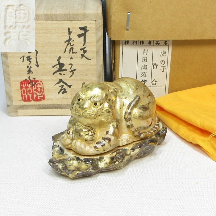 - 【A1363】茶道具 京焼の名工 八塔亭二寧 村田陶苑 色絵金彩 細工物 干支 虎ノ子 香合 親子虎 香合 共箱 共布 即決 送料無料