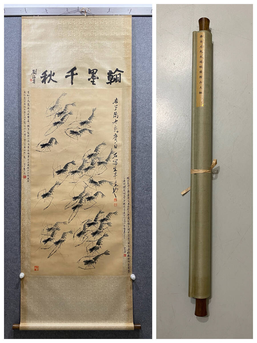 - 古美術 掛け軸 中国・近現代 「斉白石書」 紙本 【群蝦図】 立軸 書道 巻き物 肉筆保証 唐物 古画 画心133x65cm LT-2503288