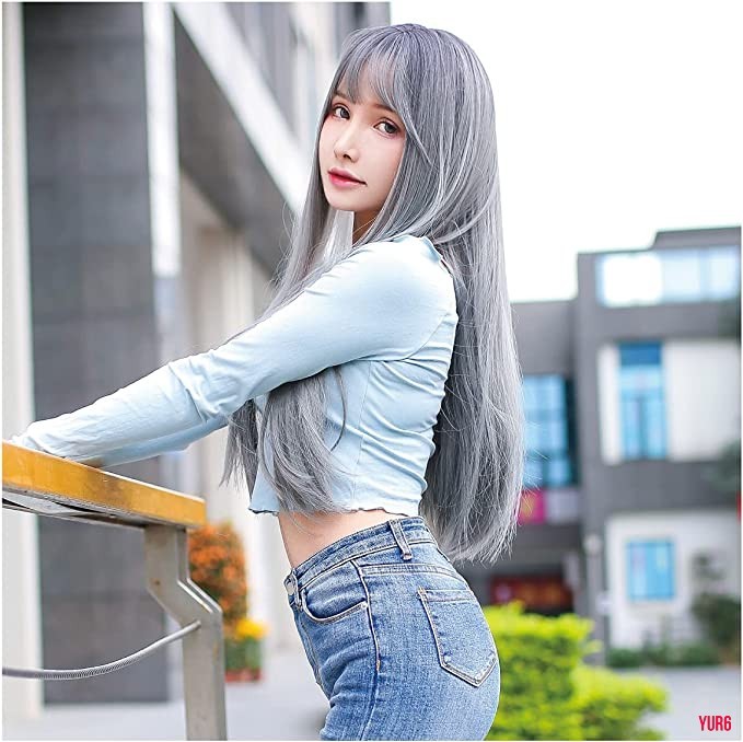 - ブラック×シルバーアッシュ ロング ストレート ウィッグ フルウィッグ かつら レディース 耐熱ファイバー アジャスター付き 普段使い