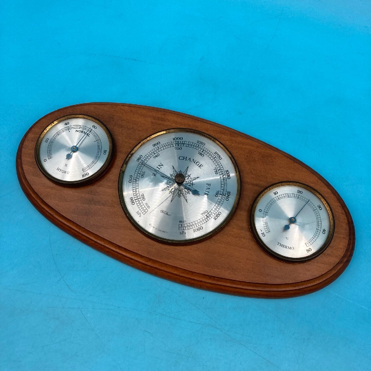 > F2【16654P195】気象計 ドイツ製 Fischer フィッシャー 気圧計 温度計 湿度計 壁掛け アナログ インテリア ヴィンテージ コレクション