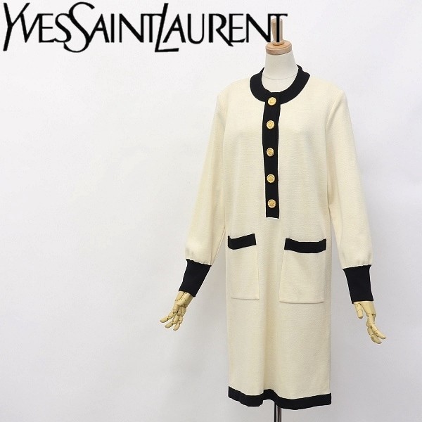 - ◆Yves Saint Laurent/イヴサンローラン 金釦 ウール ニット 長袖 ワンピース アイボリー M