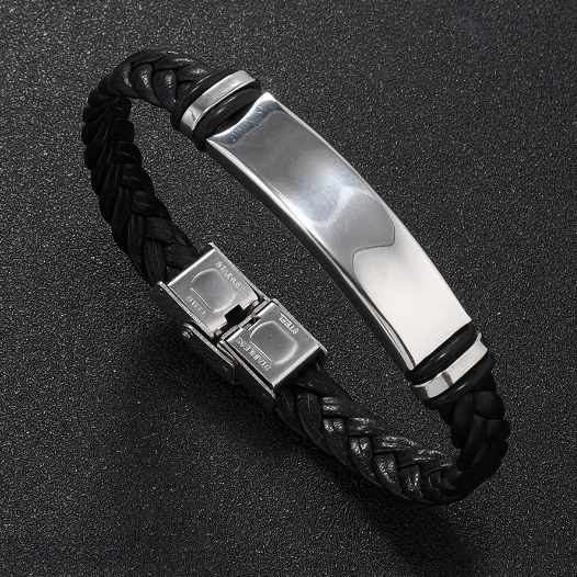 > ブレスレット 新品 編み込み メンズ レザーバングル チタンステンレス 紳士 アクセサリー 総長21センチ 長さ調整可能 /黒
