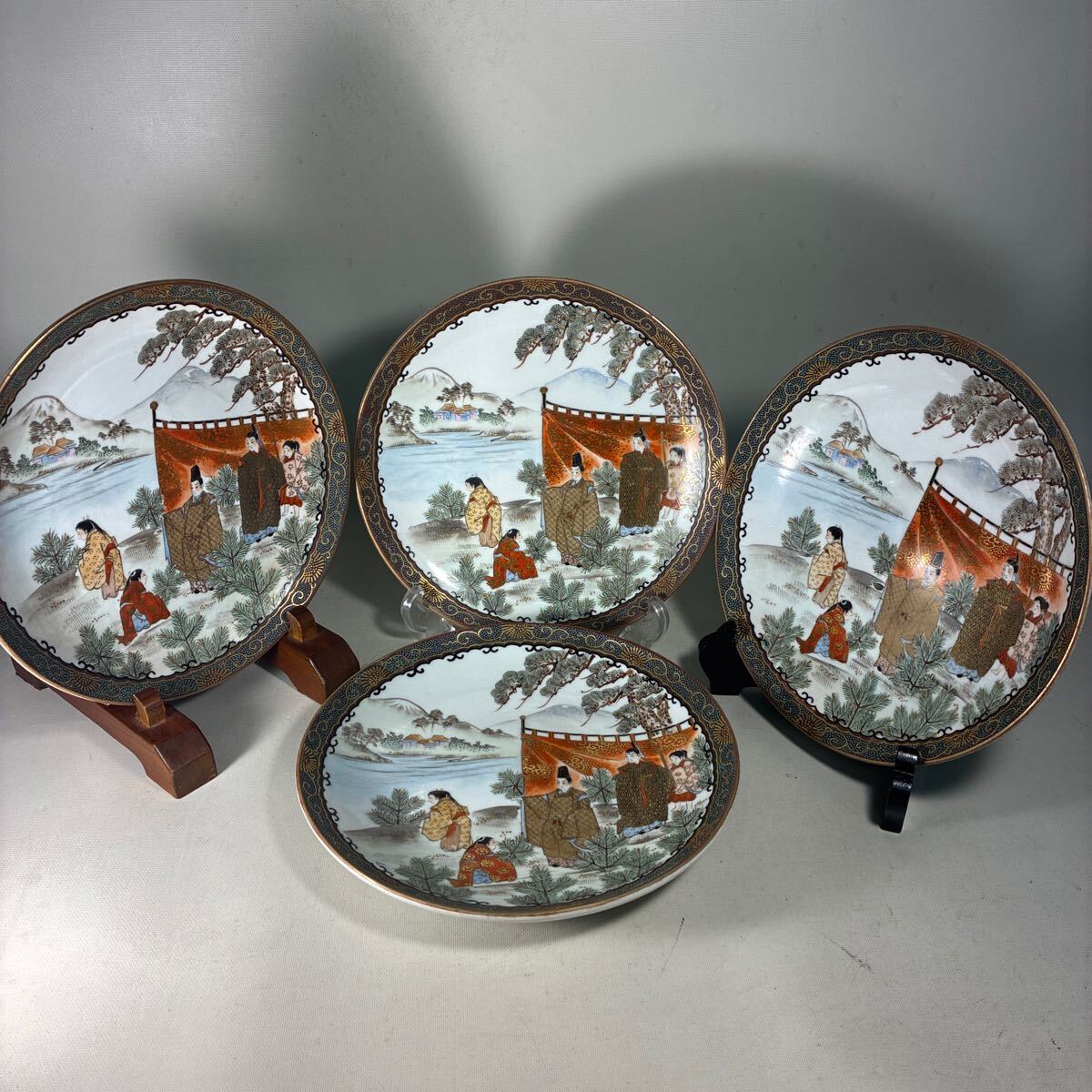 - 九谷焼 極上錦手 通り物 七寸皿4客 豪華絢爛 無傷 明治期 色絵 飾皿 金襴手 金彩 お武家様の戯れ