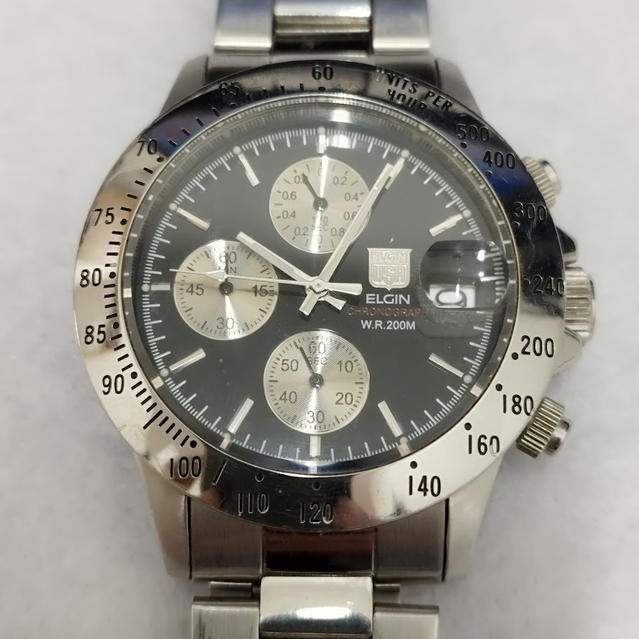 - ♯4595 ジャンク品 不動 ELGIN QZ 腕時計 エルジン クォーツ クロノグラフ 黒文字盤×SVベゼル