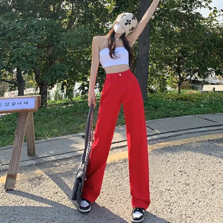 > ★大きいサイズ脚長効果★赤レッドビタミンカラー可愛い♪綿コットン快適天然素材♪ロングワイドストレート☆お洒落カラーデニムパンツ★