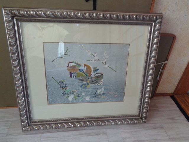 - 布絵 京友禅/額入り絵画/人間国宝 羽田登喜男/重要無形文化財「友禅」保持者/鴛鴦/真作/専用額/箱入美品-専用黒色布袋付き/