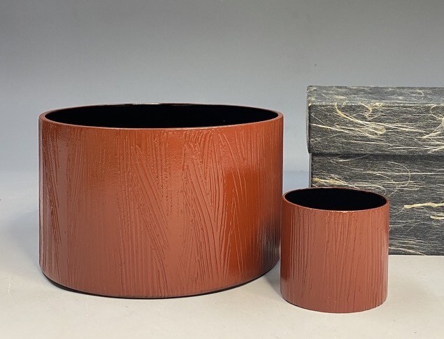 - 《2点セット 》「曲建水 蓋置」 茶道具 建水 蓋置 まとめ 朱塗 筋文 木製漆器 漆芸 紙箱 2676-6500
