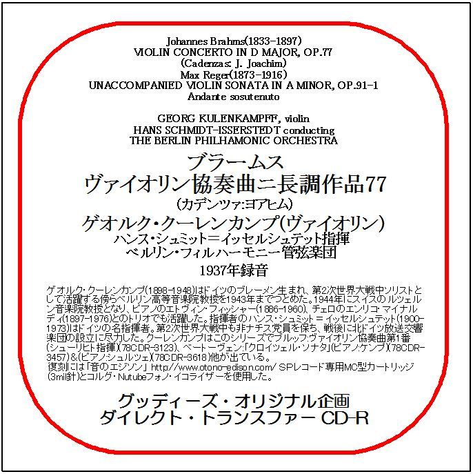 - ブラームス:ヴァイオリン協奏曲/ゲオルク・クーレンカンプ/ダイレクト・トランスファー CD-R