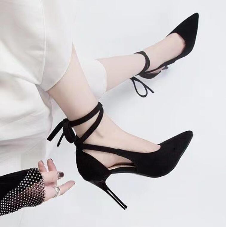 > 新入荷 / レディース ハイヒール ブラックパンプス サンダル 美脚 インテッド シューズ ピンヒール 結婚式 紐を締める / ブラック