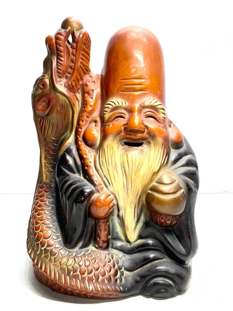 - 希少 寿老人と龍 置物 アンティーク雑貨 陶器製 七福神 縁起物 長寿 ヴィンテージインテリア A9149A10