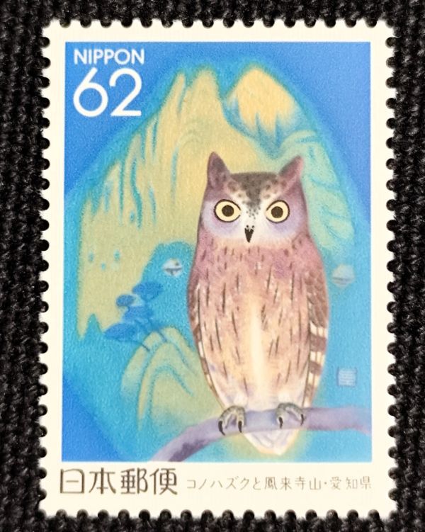 - [25041006] ふるさと切手【愛知県・コノハズクと鳳来寺山】単片「屏風岩 愛知の鳥 コノハズク」フクロウ 天然記念物 62円 1992年 美品