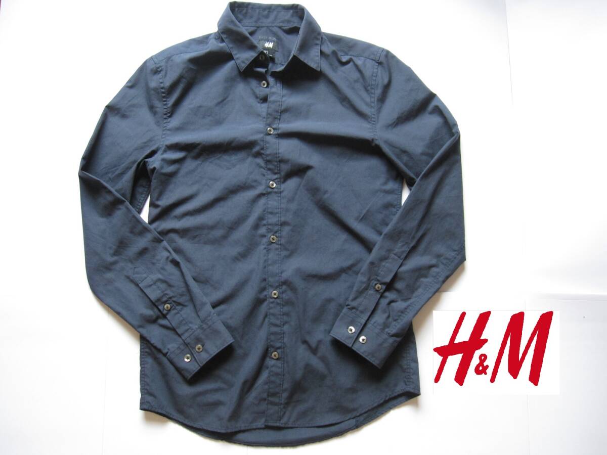 - クリックポスト送料無料 H&M メンズ 長袖シャツ Sサイズ イージーアイロン ネイビーブルー 紺色 ポリエステル 65% コットン 35% 古着