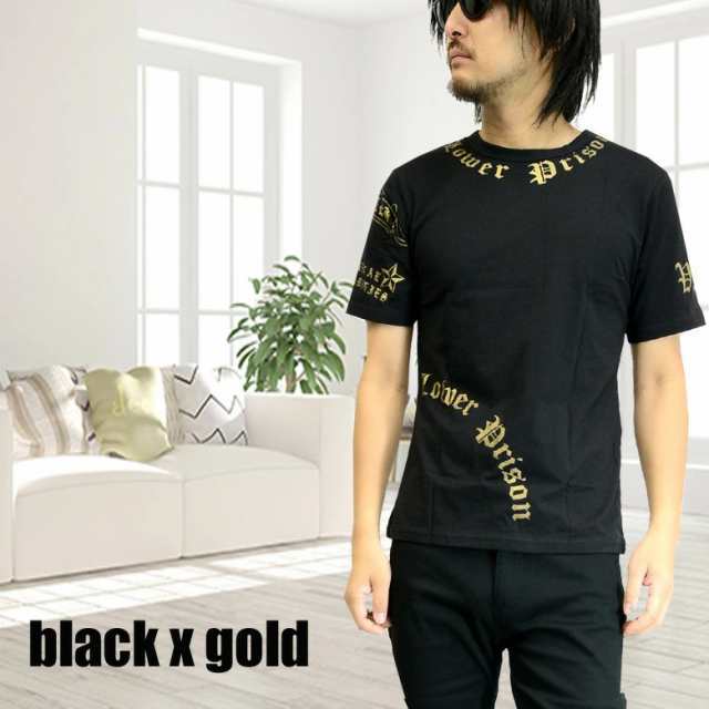 > BURST JAPAN ロゴプリント&スカルプレイハンド 合掌 ストレッチ 半袖T 70535 新品 ブラックxゴールド L