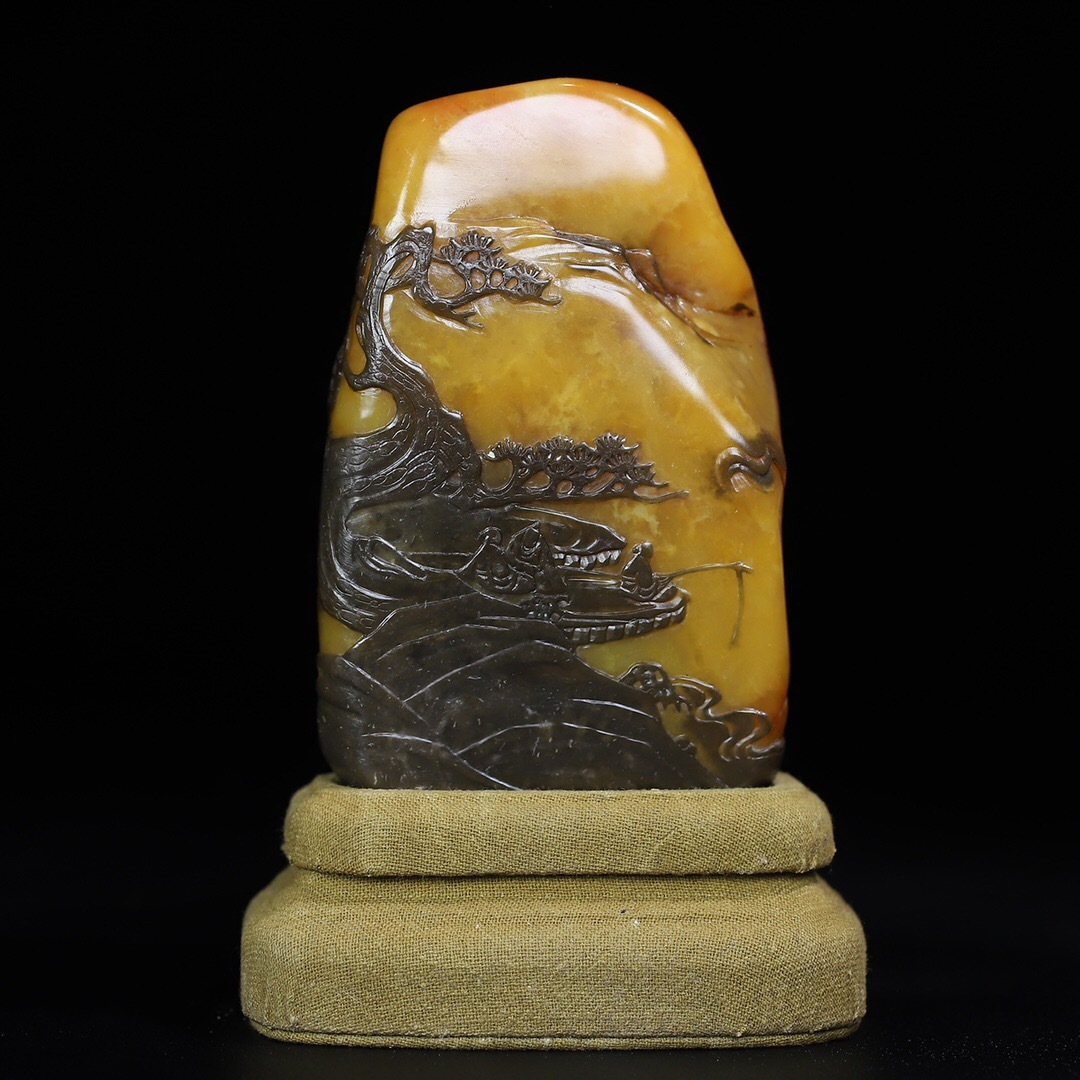 - 『館蔵珍品 寿山石 烏鴉皮 田黄石 細密彫 松下聚賢紋印章 箱付』文房具 書道品 貴重物品 収蔵品 中国古美術