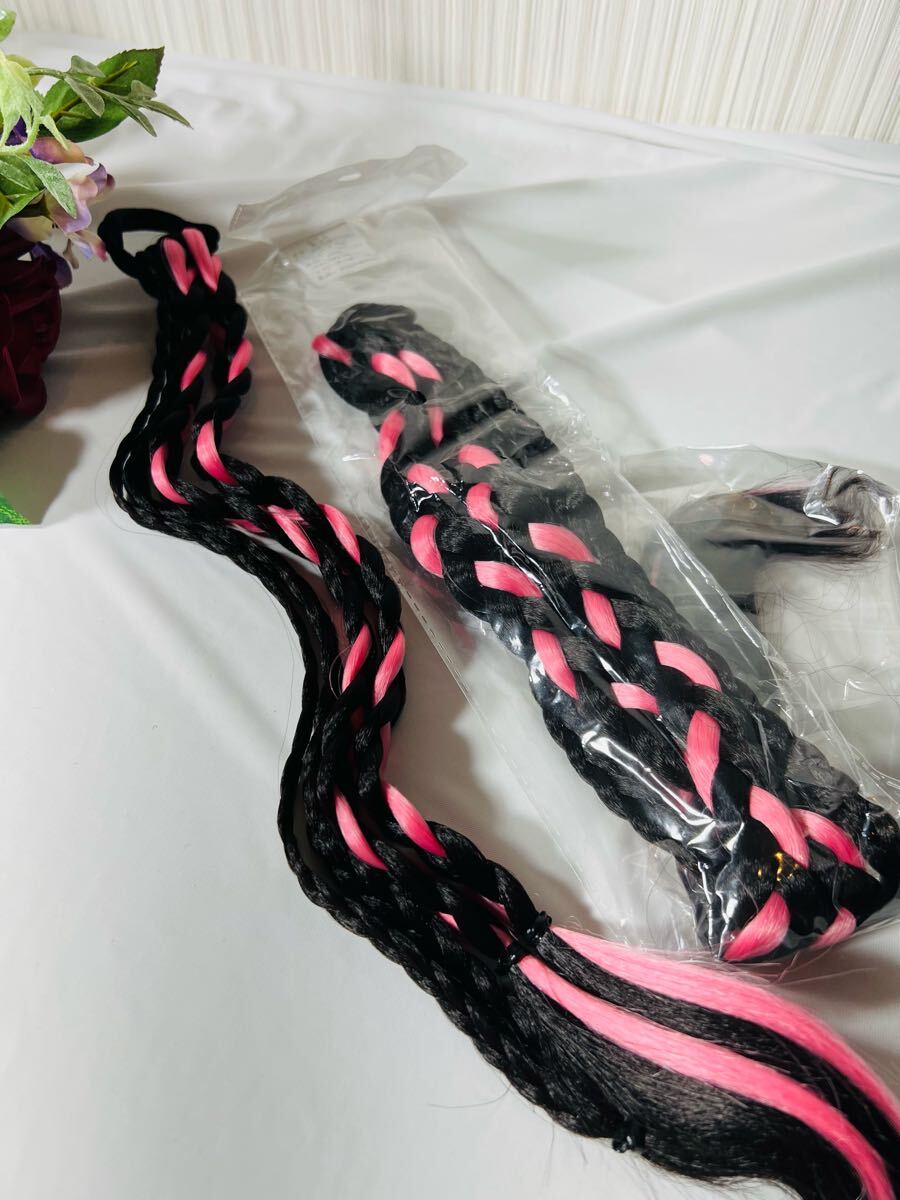 - 黒とピンクの編み込みヘアゴム 50cm