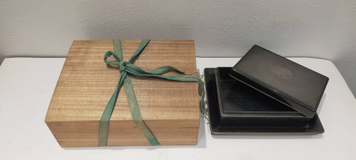 > 木製×金属製 卓上 煙草入れ&トレー 十四葉一重裏菊 皇族御下賜品? 箱有 中古品 シガレットケース タバコ たばこ 小物入れ 69204