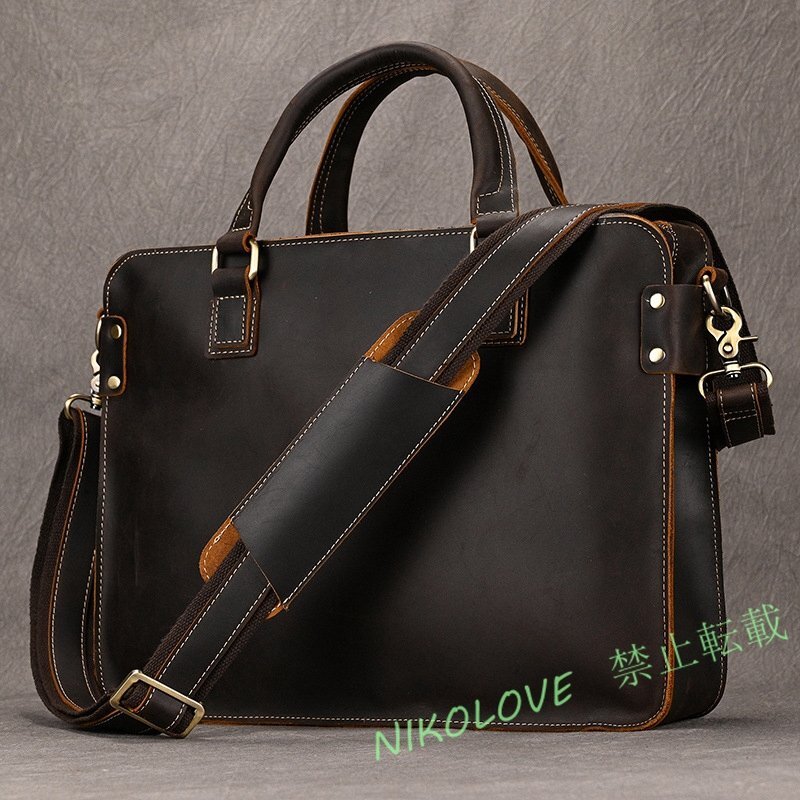 - 職人手作りヌメ革 ハンドメイド メンズバッグ 本革 ビジネスバッグ ブリーフケース PCバッグ レザー 通勤鞄 手提げバッグ ダークブラウン