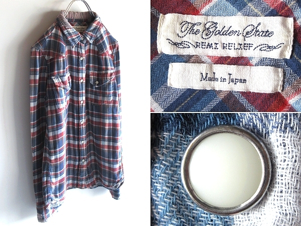 - ネコポス対応 REMI RELIEF レミレリーフ 襟袖パッチワーク コットン ダブルガーゼ ウエスタンシャツ FREE レッド ブルー BEAMS取扱ブランド