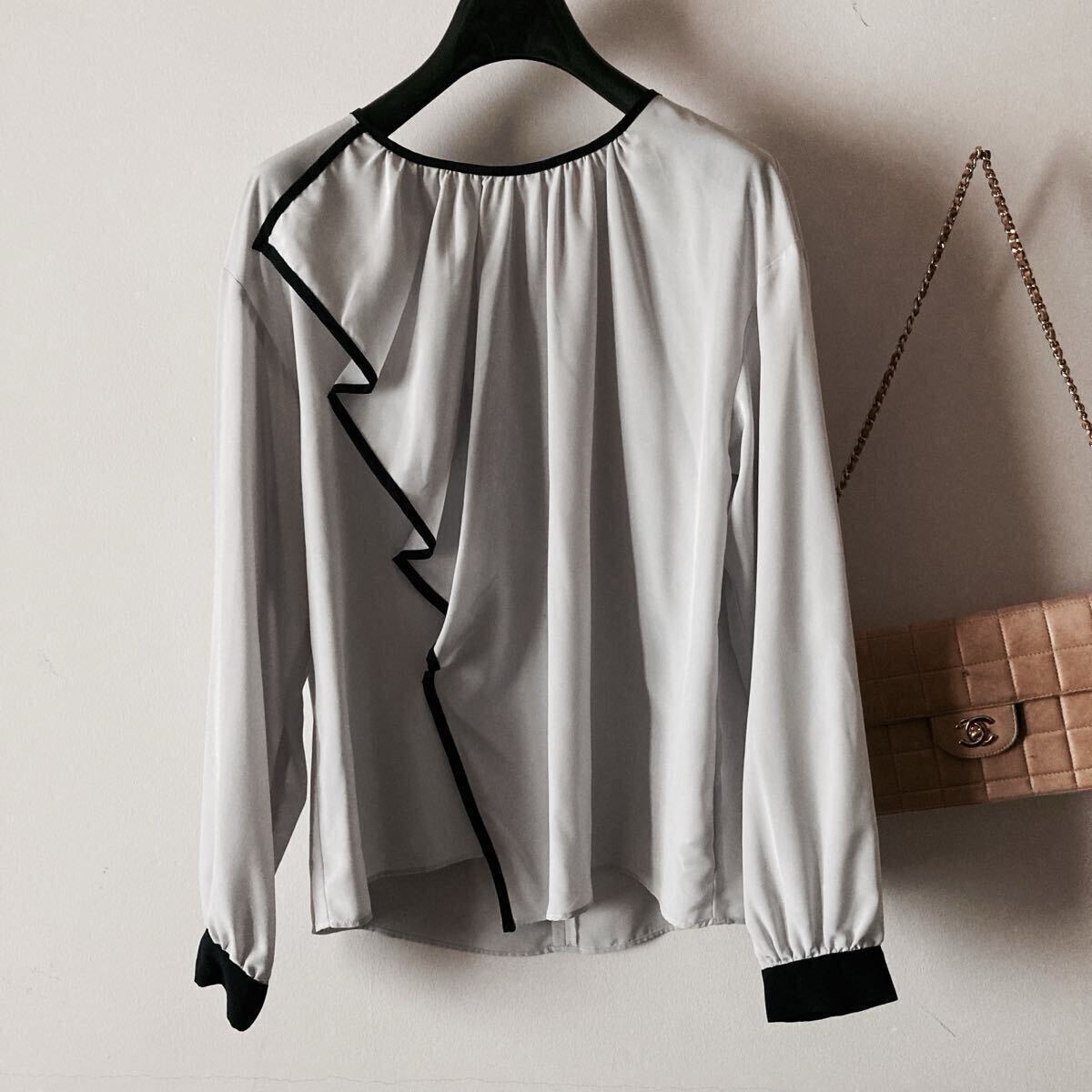 - ローファッジ*とろみ感ストレッチ プルオーバーフリルブラウス 1.5万*極淡い水色グレー