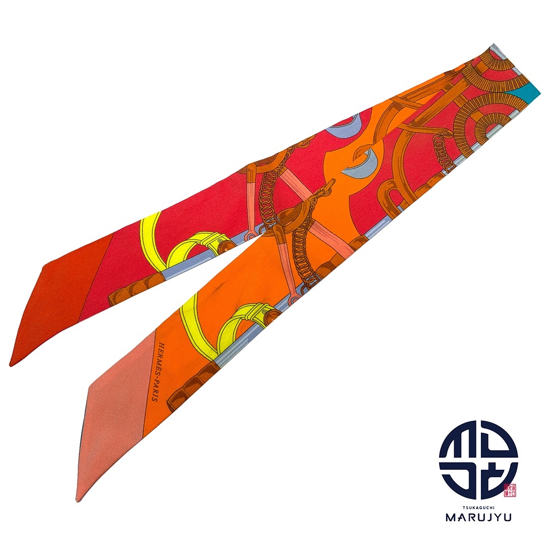 > HERMES エルメス オレンジ×ピンク ツイリー Eperon d'or 黄金の拍車 スカーフ ブランド 小物