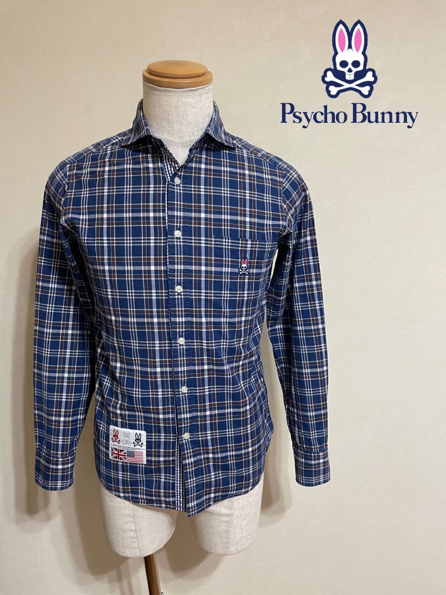 - 【良品】 PsychoBunny サイコバニー タータンチェック柄 コットン シャツ トップス サイズS 長袖 ネイビー 茶 スカル兎