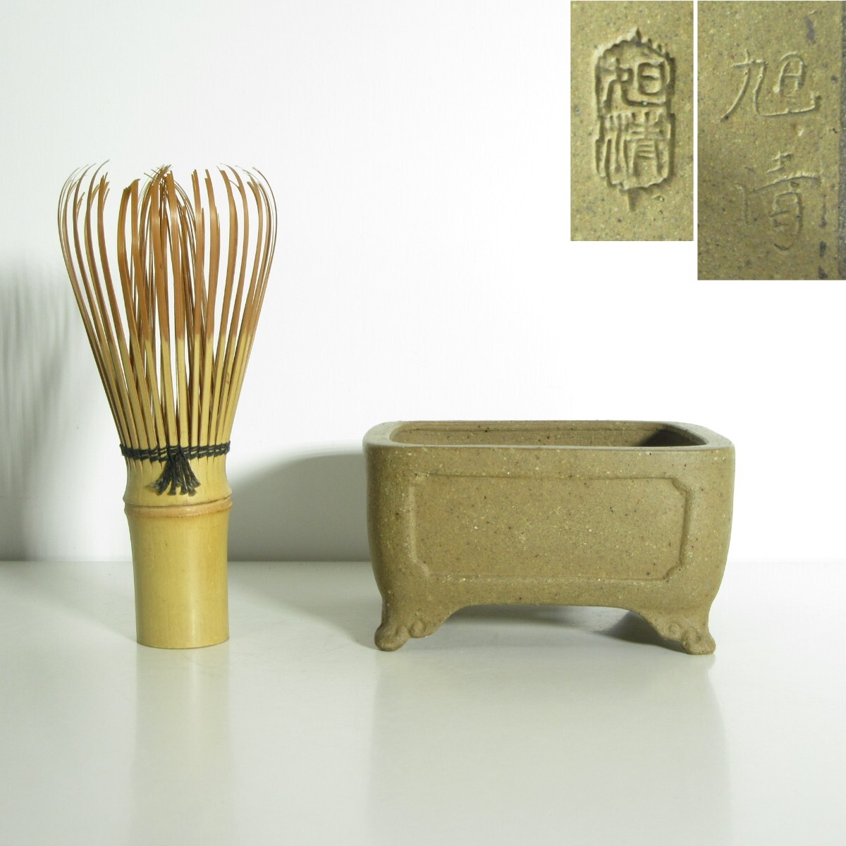 > 『 旭清 雲脚窓入長方鉢 ( 旭清作 )』落款有り A1/ 和鉢 盆栽鉢 角鉢 山野草鉢 植木鉢 盆器 / 小品盆栽 山野草に!【 盆栽用品・鉢 】