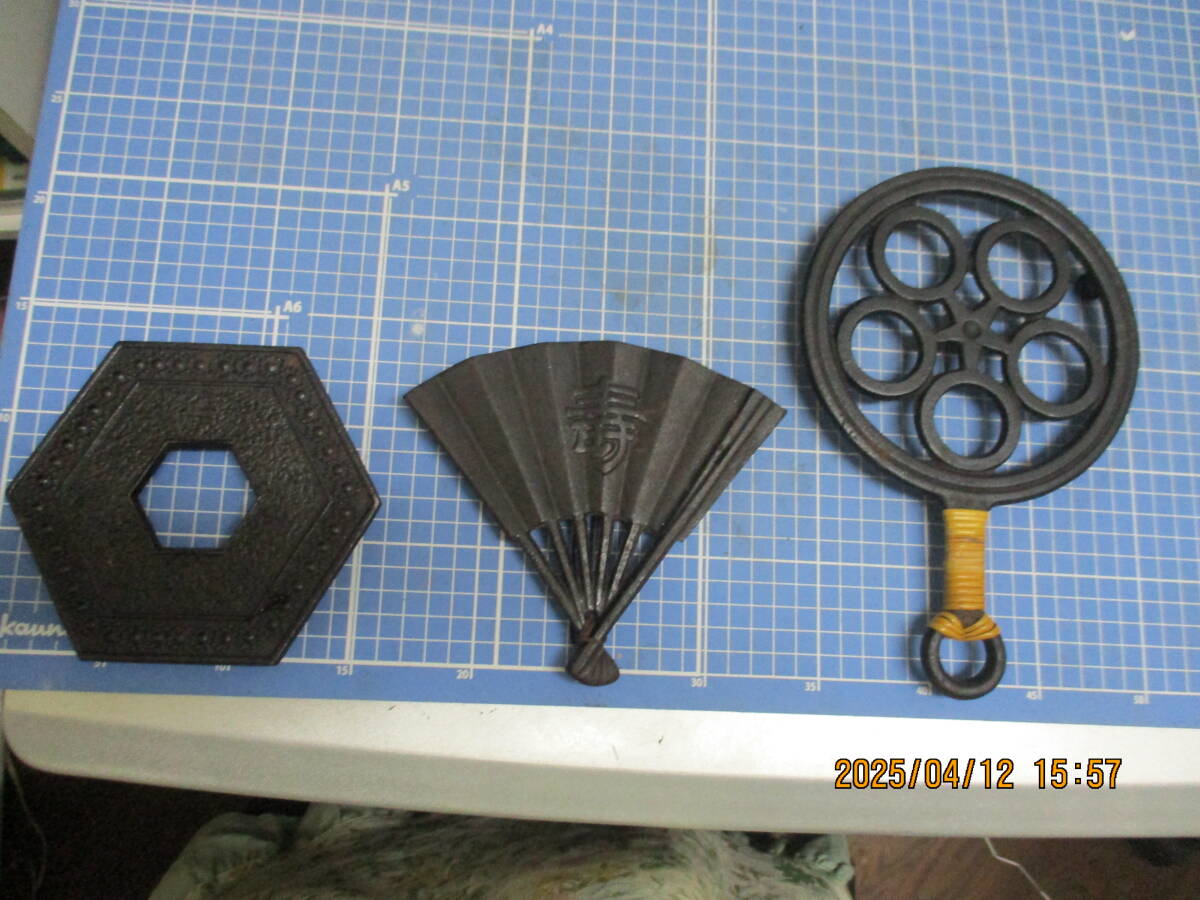 - 南部鉄器 鍋敷き3点 在銘(岩鋳・南部)他 検 アンティーク、コレクション 工芸品 金属工芸 鉄製