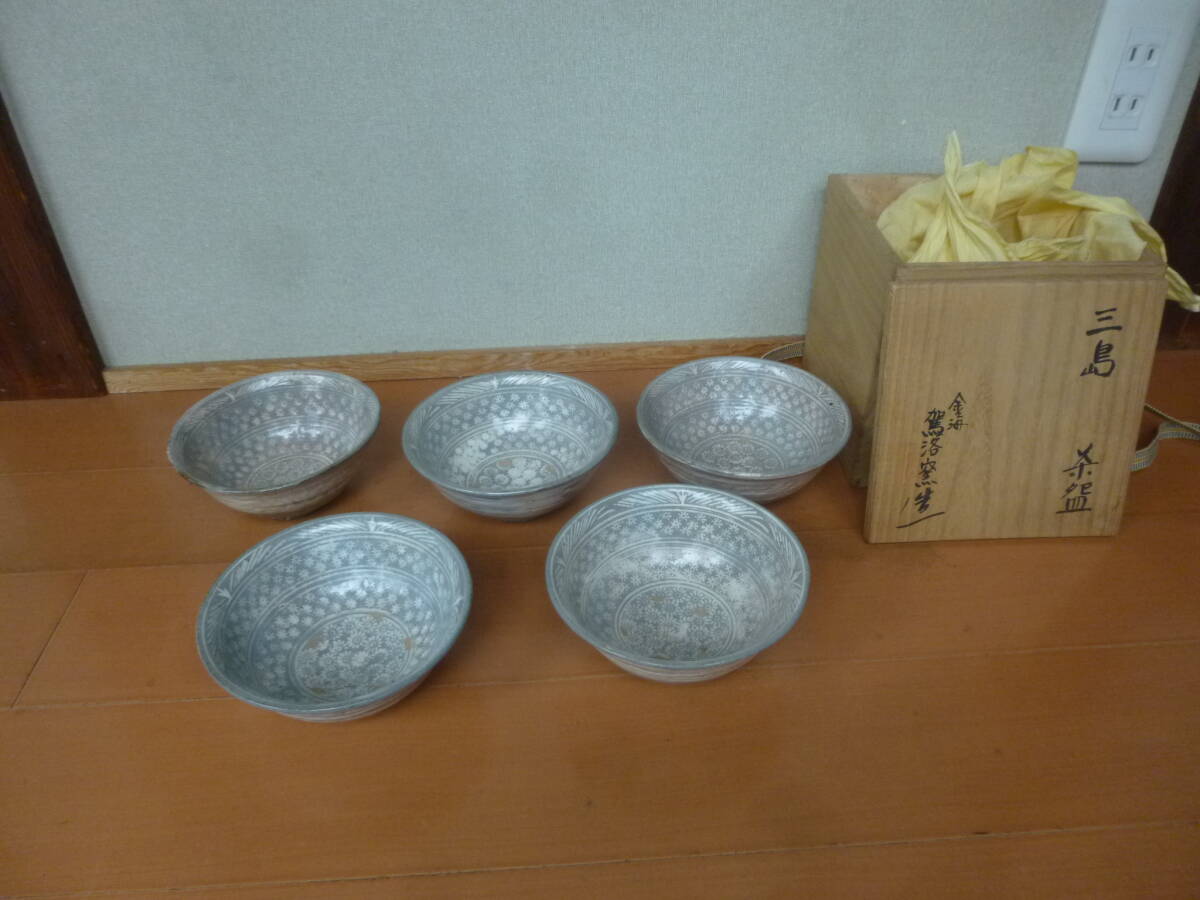 - 刷毛三島茶碗(五客)・金海駕洛窯(三代清水日呂志)・共箱