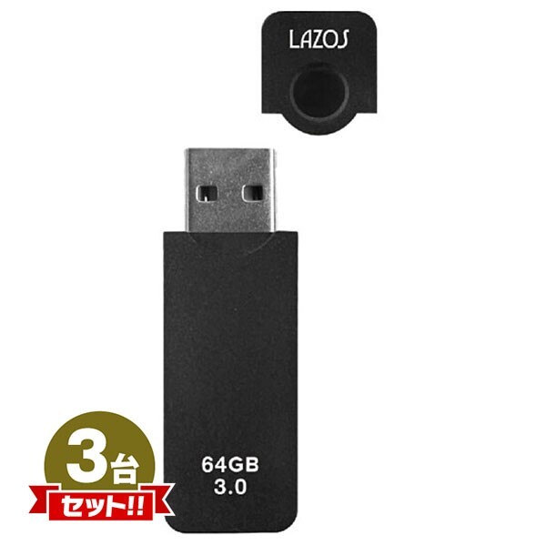 > Lazos 64GB キャップ式USBフラッシュメモリ [L-US64-CPB] USB3.0接続 ブラック 3点セット
