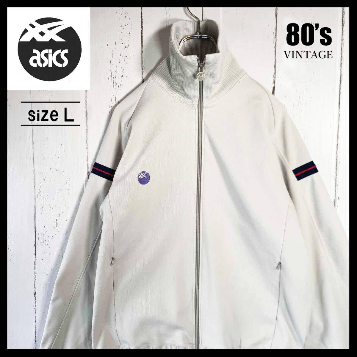 > 【USED】 アシックス asics ビンテージ トラックジャケット ジャージ 刺繍ロゴ 80s 古着 日本製 Lサイズ アイボリー ☆送料無料☆